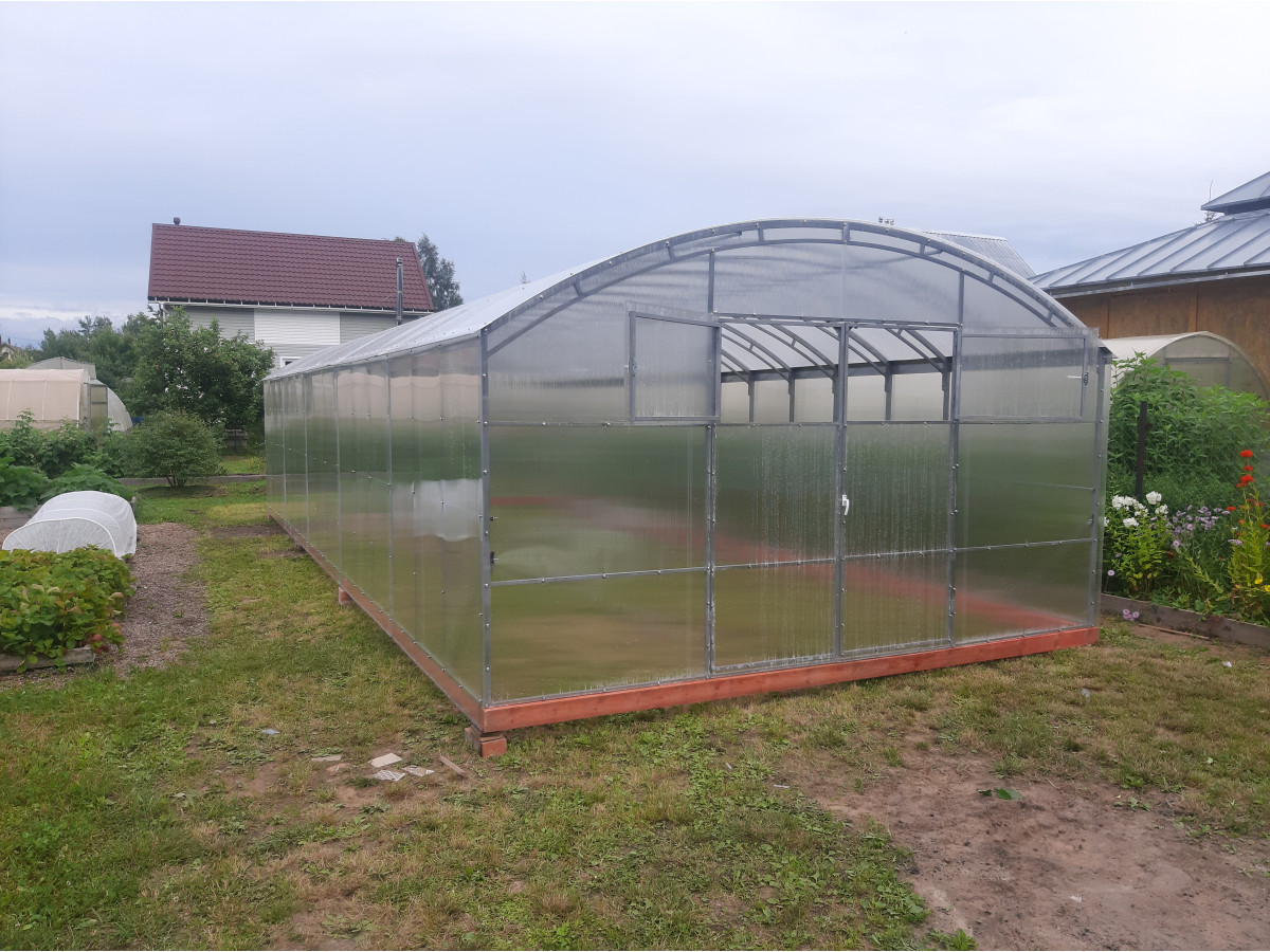 • широкая 4 м, ширина теплицы позволяет организовать 3 широкие полноценные грядки с комфортными проходами между ними;
